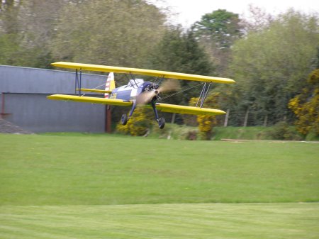 The Big Stearman Climbing out on it's first flight of many on Sunday. Nigel has the strip in great shape. |