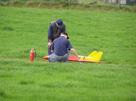 Getting the Turbine L39 Albatros ready for its first flight in which he enjoyed himself so much he ran out of fuel, and had to make a landing in the next field ! All was ok and flew it again later on. This is the result of a Mid Air with a Weston Cougar Both models managed to land ok, Robert even managed a circuit with one aileron !